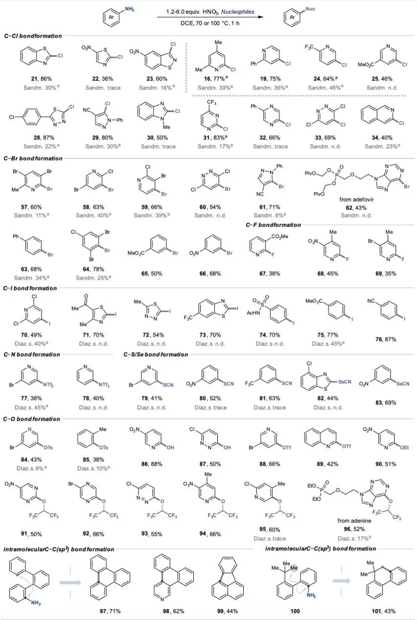該研究利用芳香胺在硝酸介導下原位形成N-硝胺中間體,隨后通過脫除一氧化二氮(N?O),實現(xiàn)芳香C?N鍵向多種C?X鍵(包括C?Br, C?Cl, C?I, C?F, C?N, C?S, C?Se與C?O)以及C?C鍵的高效直接轉化。與經(jīng)典的Sandmeyer反應條件相比,新方法在藥物合成中常用的多氮雜環(huán)體系里展現(xiàn)出顯著優(yōu)勢;與其他脫氨官能化方法相比,此策略的核心優(yōu)勢在于僅憑實驗室極易獲取的簡單試劑,就實現(xiàn)了出色的通用性:幾乎適用于所有類型的藥用雜芳胺及電性、結構各異的苯胺衍生物,不受氨基位置限制,并且能夠以簡易操作實現(xiàn)公斤級的規(guī)?;a(chǎn)。