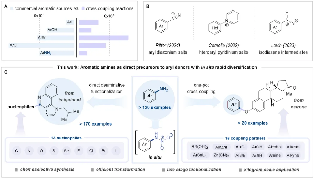 芳香胺作為生物活性分子里極為常見的官能團之一,廣泛存在于藥物、天然產(chǎn)物以及農藥等多種化合物結構之中。盡管其在分子構建中扮演著重要的結構基石角色,然而將其用作合成砌塊的研究進展卻相對滯后,尚未得到充分開發(fā)。在過去的一個多世紀里,工業(yè)領域通常先將芳香胺轉化為名為“重氮鹽”的中間體,進而利用重氮化合物的高反應活性開展后續(xù)轉化。該分步策略存在諸多弊端,如重氮鹽穩(wěn)定性差、具有爆炸危險性,基于芳基重氮鹽的工藝還面臨化學計量級銅消耗大、底物兼容性受限等問題。