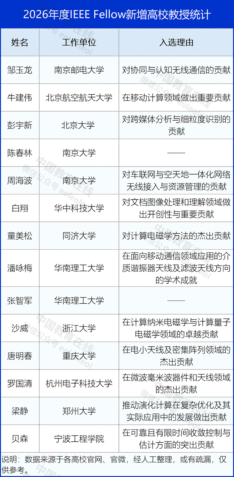 11月27日,國際電氣和電子工程師協(xié)會(IEEE)公布2026年度新晉Fellow名單。