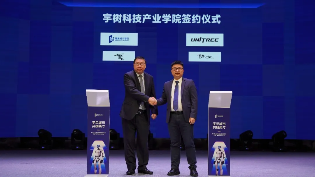 青島城市學(xué)院校長(zhǎng)郭凱佳教授與宇樹(shù)科技聯(lián)合創(chuàng)始人陳立先生共同簽署協(xié)議,標(biāo)志著雙方的合作從單一項(xiàng)目向體系化、學(xué)院化深度融合的戰(zhàn)略跨越,共同構(gòu)建具身智能時(shí)代應(yīng)用型人才培養(yǎng)的新范式。