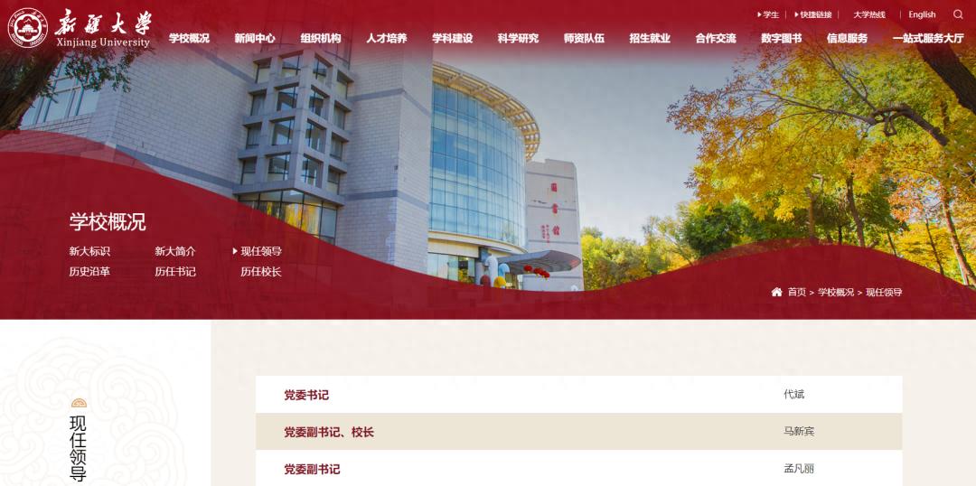 4月16日,新疆大學(xué)官網(wǎng)“現(xiàn)任領(lǐng)導(dǎo)”欄更新顯示,此前擔(dān)任新疆大學(xué)黨委副書(shū)記、副校長(zhǎng)的馬新賓,已任新疆大學(xué)黨委副書(shū)記、校長(zhǎng)。
