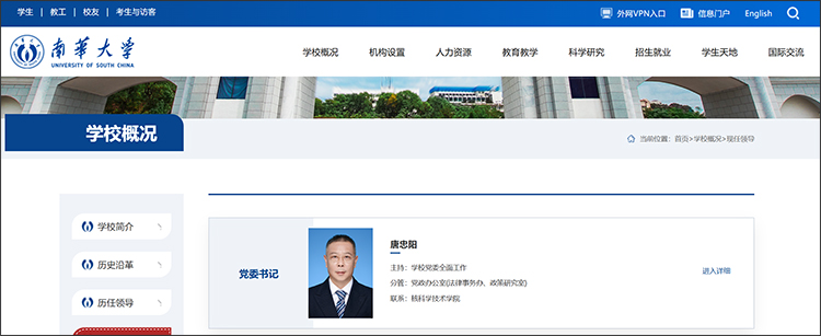 近日,南華大學(xué)官方網(wǎng)站“現(xiàn)任領(lǐng)導(dǎo)”一欄更新后顯示,唐忠陽已任南華大學(xué)黨委書記,主持學(xué)校黨委全面工作。