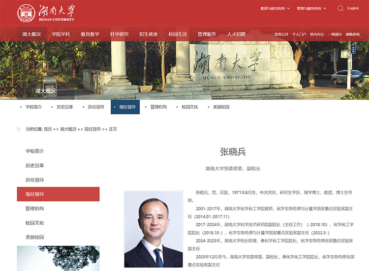 近日,湖南大學(xué)官網(wǎng)“現(xiàn)任領(lǐng)導(dǎo)”一欄更新顯示,張曉兵教授已任湖南大學(xué)黨委常委、副校長(zhǎng)。據(jù)悉,張曉兵曾于2023年、2025年連續(xù)入選中國(guó)科學(xué)院化學(xué)部院士增選有效候選人名單。