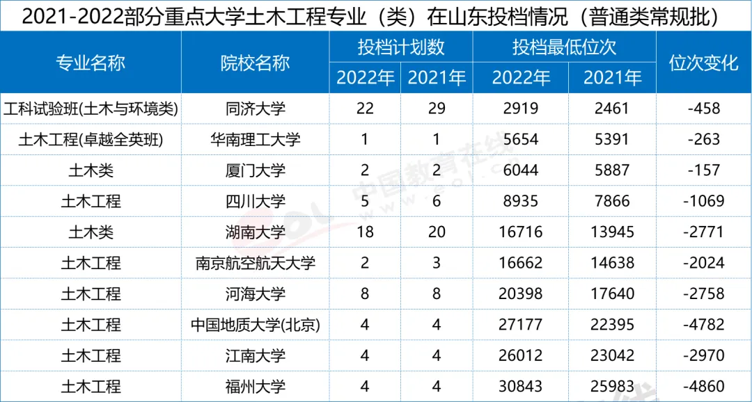 根據(jù)中國教育在線發(fā)布的《2023高招調(diào)查報告》,全國范圍大部分高校土木專業(yè)分?jǐn)?shù)都出現(xiàn)了明顯的滑坡,錄取分?jǐn)?shù)(位次)出現(xiàn)了不同程度的下跌。同濟大學(xué)在山東的錄取位次下跌了400多,中國地質(zhì)大學(xué)(北京)在招生總量未變的情況下,錄取考生的位次下跌了近5000個位次,四川大學(xué)與湖南大學(xué)則分別下跌1069和2771個位次。