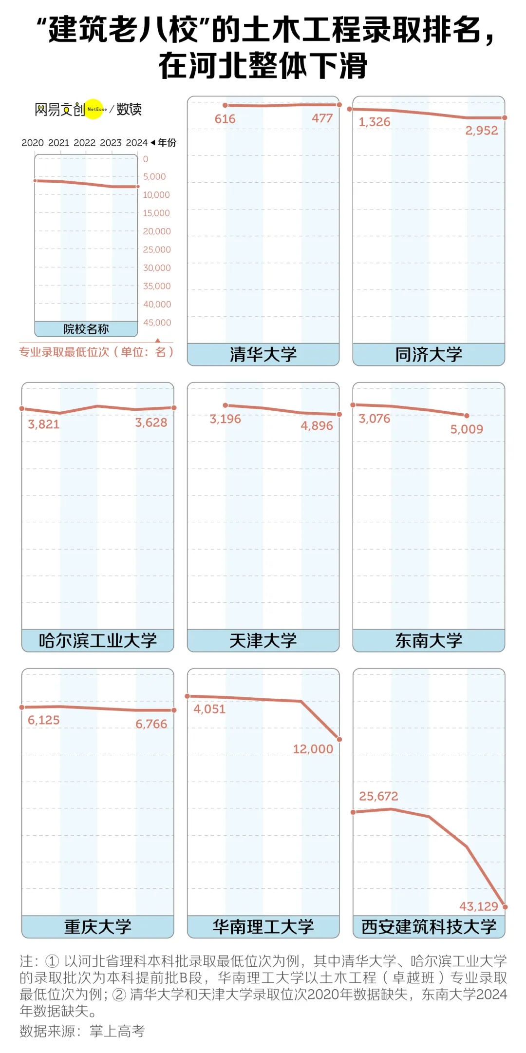 2020年以來,在土木業(yè)內(nèi)擁有重大影響力的“建筑老八?!痹诤颖钡母呖间浫≈?,除了清華大學(xué)、哈工大的最低錄取名次在“悶聲”回升外,其他學(xué)校的錄取位次大多有所下跌。相較往年,2024年華南理工大學(xué)在河北的最低錄取位次掉落了近七千名,西安建筑科技大學(xué)更是暴跌一萬多名。