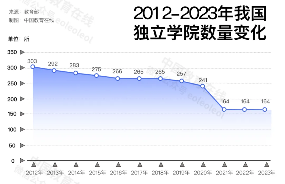 教育部發(fā)布的2023年全國(guó)教育事業(yè)發(fā)展基本情況顯示,全國(guó)獨(dú)立學(xué)院共有164所,占全部本科高校數(shù)量(1275所)的12.86%。而在2012年獨(dú)立學(xué)院還有303所,在當(dāng)年的本科高校中占比26.46%。
