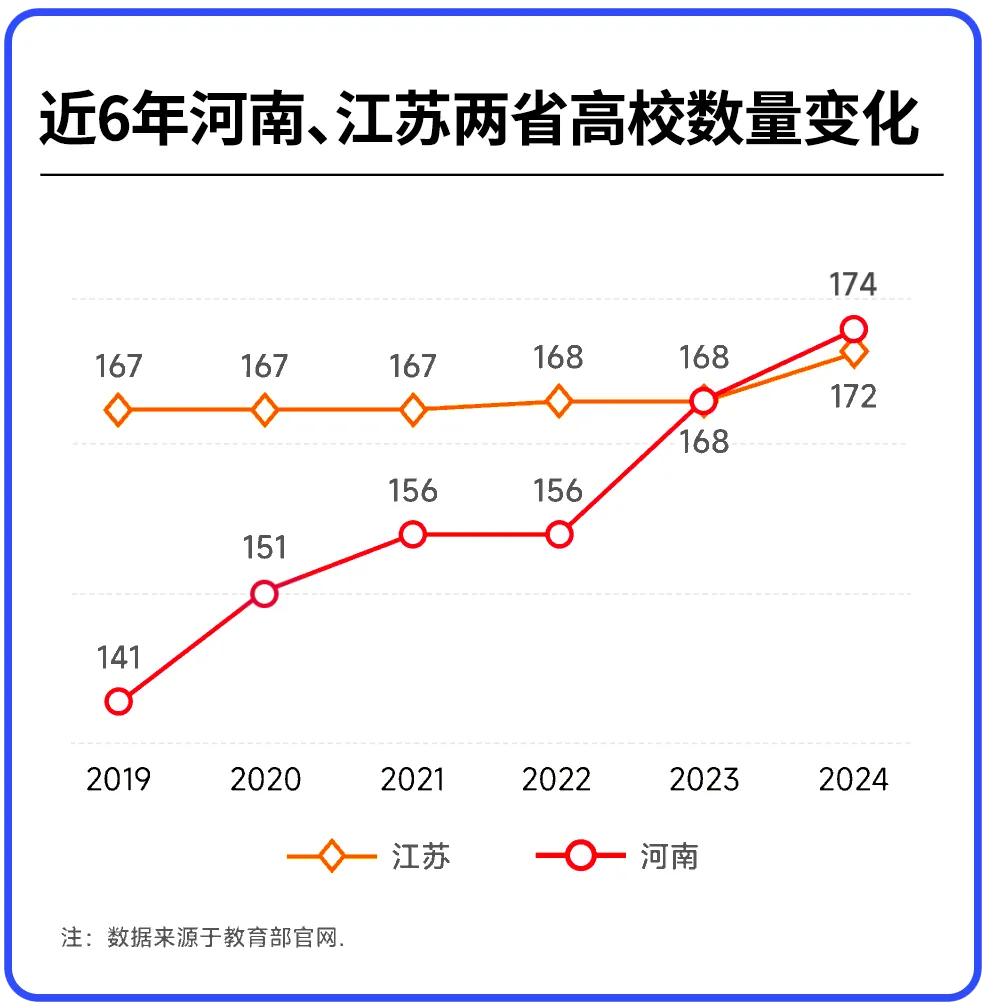 近年來(lái),隨著一批批新大學(xué)的設(shè)立,全國(guó)高校數(shù)量分布也在發(fā)生變化。據(jù)教育部官網(wǎng)2024年6月21日發(fā)布的《全國(guó)高校學(xué)校名單》顯示,截至2024年6月20日,河南高校數(shù)量達(dá)到174所,超越江蘇(172所),正式晉級(jí)全國(guó)“高校數(shù)量第一省”。