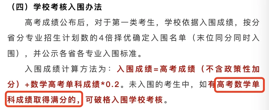 如:北理工招生簡(jiǎn)章明確,未入圍的考生,如有高考數(shù)學(xué)單科成績(jī)?nèi)〉脻M分的,可破格入圍學(xué)校考核。