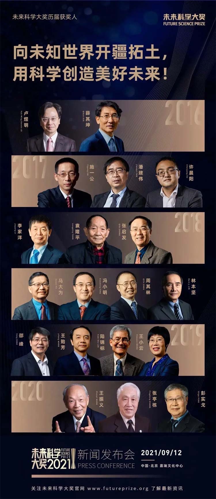 2016年至今,未來科學大獎共評選出19位獲獎者,獲得了科學和社會領域的廣泛認可。他們均是來自生命科學、物理、化學、數(shù)學、計算機等基礎和應用研究領域極具成就的科學家。他們分別是: