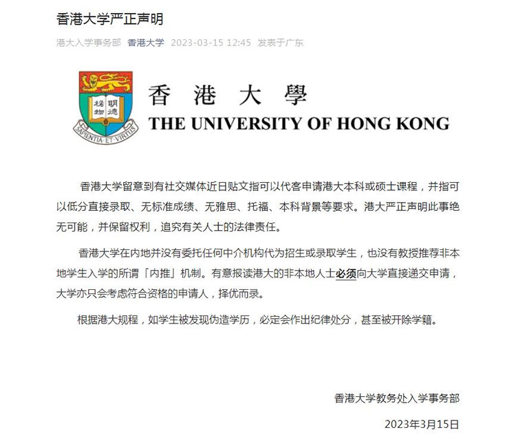 中新網(wǎng)3月15日電 據(jù)香港大學(xué)微信公眾號(hào)消息,15日,香港大學(xué)教務(wù)處入學(xué)事務(wù)部發(fā)布聲明指,香港大學(xué)留意到有社交媒體近日貼文指可以代客申請(qǐng)港大本科或碩士課程,并指可以低分直接錄取、無(wú)標(biāo)準(zhǔn)成績(jī)、無(wú)雅思、托福、本科背景等要求。港大嚴(yán)正聲明此事絕無(wú)可能,并保留權(quán)利,追究有關(guān)人士的法律責(zé)任。