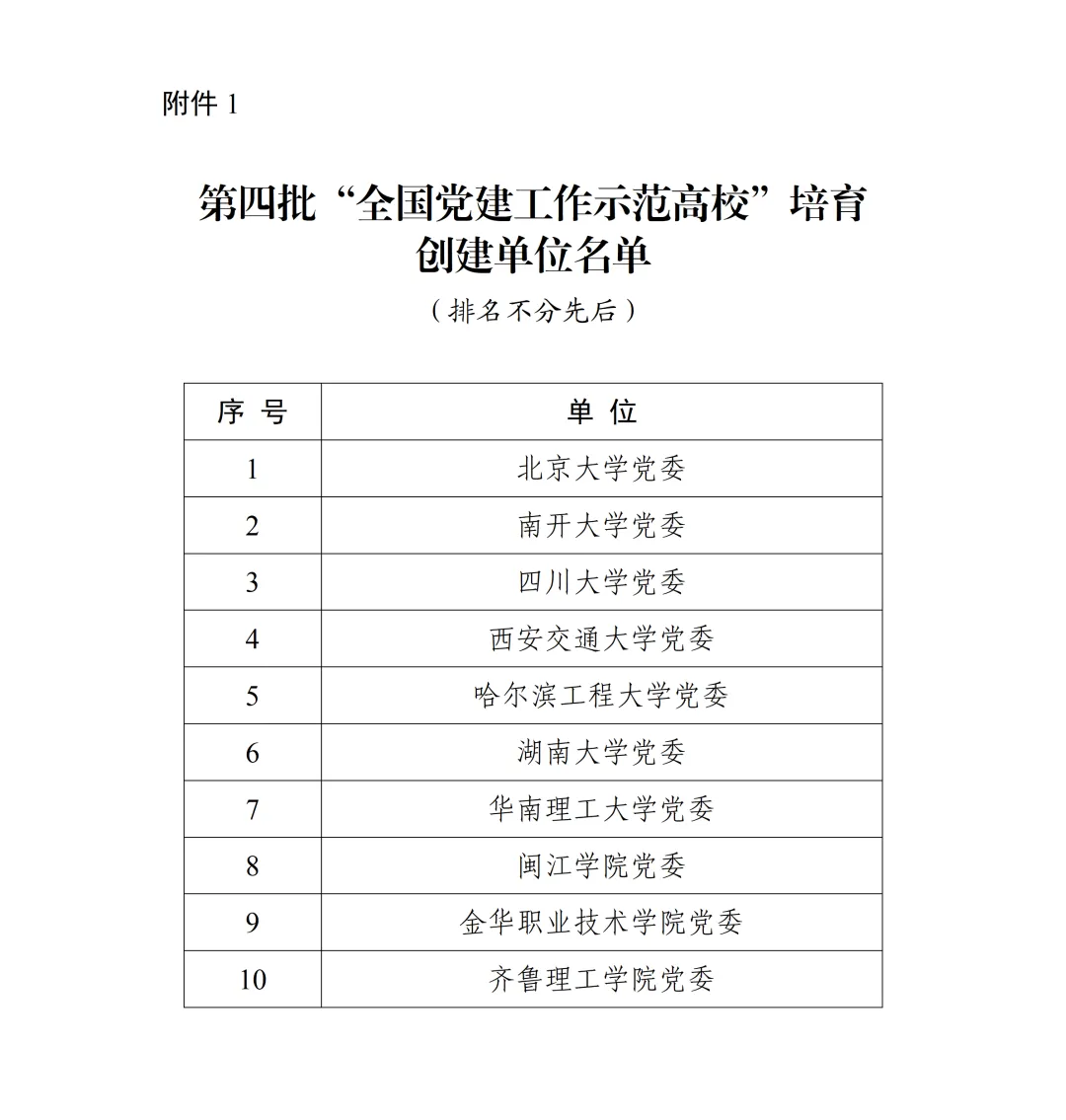 近日,教育部公布第四批全國黨建工作示范高校、標桿院系、樣板支部培育創(chuàng)建單位名單。經(jīng)省級黨委教育工作部門推薦、資格審查、專家推薦、教育部黨的建設和全面從嚴治黨工作領導小組成員單位集中審議、結果公示,遴選產(chǎn)生了10個全國黨建工作示范高校、100個全國黨建工作標桿院系、1001個全國黨建工作樣板支部培育創(chuàng)建單位。各培育創(chuàng)建單位建設周期為2年,自通知發(fā)布日起至2026年3月。一起來看名單——