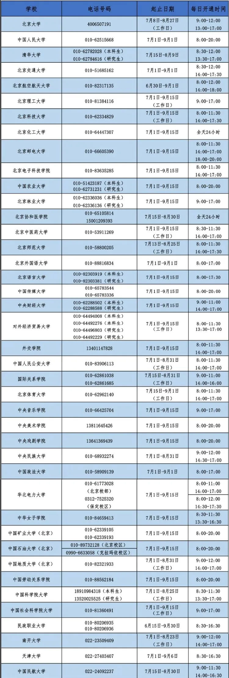 同時,各省(自治區(qū)、直轄市)和中央高校同步開通熱線電話,電話號碼與每日開通時間如下。