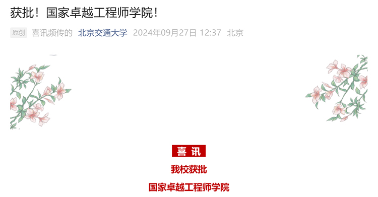 北京交通大學(xué)官微9月27日發(fā)布消息,學(xué)校獲批國(guó)家卓越工程師學(xué)院!