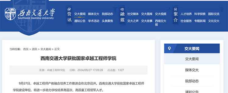 27日,西南交通大學(xué)官網(wǎng)發(fā)布消息稱,9月27日,卓越工程師產(chǎn)教融合培養(yǎng)工作推進(jìn)會(huì)在北京召開(kāi)。西南交通大學(xué)獲批國(guó)家卓越工程師學(xué)院建設(shè)單位,將進(jìn)一步助力學(xué)校培養(yǎng)高層次、高質(zhì)量工程領(lǐng)軍人才。
