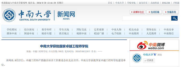 28日,中南大學(xué)官網(wǎng)發(fā)布消息稱:9月27日,卓越工程師產(chǎn)教融合培養(yǎng)工作推進(jìn)會(huì)在北京召開(kāi)。中南大學(xué)獲批國(guó)家卓越工程師學(xué)院建設(shè)單位。