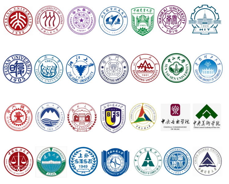 北京大學(xué)、中國人民大學(xué)、清華大學(xué)、北京航空航天大學(xué)、中國農(nóng)業(yè)大學(xué)、南開大學(xué)、哈爾濱工業(yè)大學(xué)、復(fù)旦大學(xué)、同濟(jì)大學(xué)、浙江大學(xué)、廈門大學(xué)、山東大學(xué)、中山大學(xué)、華南理工大學(xué)、西安交通大學(xué)、東北大學(xué)、湖南大學(xué)、北京外國語大學(xué)、中國傳媒大學(xué)、中央音樂學(xué)院、中央美術(shù)學(xué)院、中國政法大學(xué)、遼寧大學(xué)、上海外國語大學(xué)、中國地質(zhì)大學(xué)(北京)、中南財(cái)經(jīng)政法大學(xué)、西北大學(xué)、中國計(jì)量大學(xué)