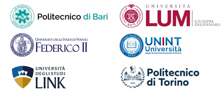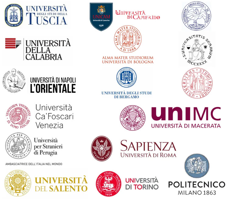 巴里L(fēng)UM大學(xué)、巴里理工大學(xué)、貝加莫大學(xué)、博洛尼亞大學(xué)、都靈大學(xué)、都靈理工大學(xué)、卡拉布里亞大學(xué)、卡梅里諾大學(xué)、羅馬Link校園大學(xué)、羅馬國際研究大學(xué)、羅馬第一大學(xué)、馬切拉塔大學(xué)、米蘭理工大學(xué)、那不勒斯東方大學(xué)、那不勒斯費(fèi)德里科二世大學(xué)、那不勒斯“帕特諾普”大學(xué)、佩魯賈外國人大學(xué)、帕多瓦大學(xué)、薩倫托大學(xué)、圖西亞大學(xué)、威尼斯大學(xué)、錫耶納大學(xué)