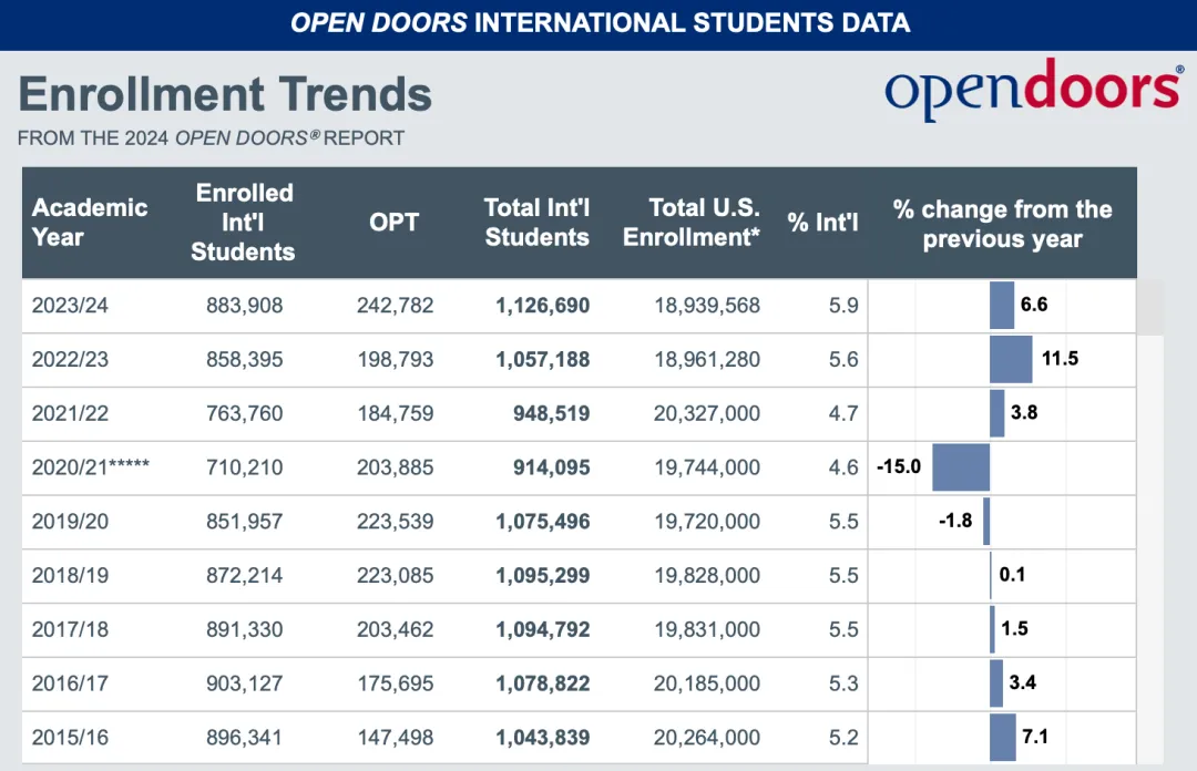 根據(jù)Open Doors 2024最新數(shù)據(jù),2023/2024學(xué)年在美國(guó)留學(xué)的國(guó)際學(xué)生數(shù)量達(dá)1126690人,同比增長(zhǎng)6.6%,創(chuàng)造歷史最高紀(jì)錄。