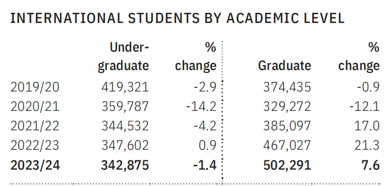 在學(xué)術(shù)層次方面,本科留學(xué)生人數(shù)為342,875人,略有下降;而研究生人數(shù)則達(dá)到502,291人,同比增長(zhǎng)7.6%,顯示出越來(lái)越多國(guó)際學(xué)生傾向于赴美攻讀研究生學(xué)位。