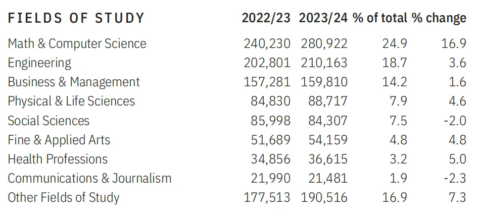在專(zhuān)業(yè)選擇方面,數(shù)學(xué)與計(jì)算機(jī)科學(xué)專(zhuān)業(yè)依舊是國(guó)際學(xué)生的首選,共有280,922人就讀,其次是工程類(lèi)專(zhuān)業(yè),共計(jì)210,163人。商業(yè)與管理專(zhuān)業(yè)也廣受歡迎,就讀人數(shù)達(dá)到159,810人。STEM領(lǐng)域的留學(xué)熱度持續(xù)升溫,占據(jù)了整體國(guó)際學(xué)生群體中的半壁江山。