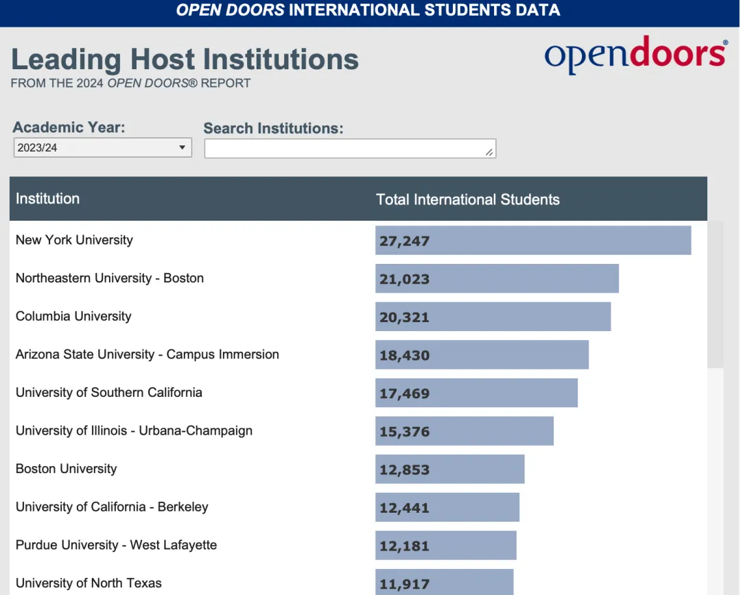 紐約大學(xué)以27,247名國(guó)際學(xué)生繼續(xù)穩(wěn)居榜首,成為最受歡迎的院校。緊隨其后的是東北大學(xué)波士頓校區(qū)、哥倫比亞大學(xué)、亞利桑那州立大學(xué)和南加州大學(xué)等。