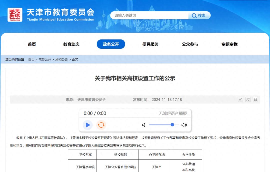 日前,天津市教委網(wǎng)站發(fā)布《關(guān)于我市相關(guān)高校設(shè)置工作的公示》,天津擬申報一所公安本科院?!旖蚓鞂W(xué)院,該校以天津公安警官職業(yè)學(xué)院為基礎(chǔ)。