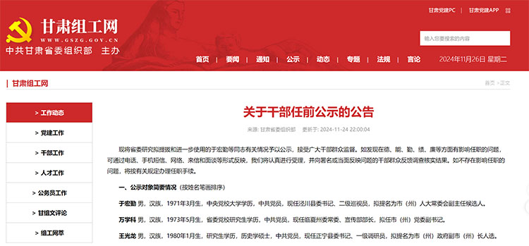 11月24日,中共甘肅省委組織部發(fā)布一批干部任前公示,其中涉及18所高校。