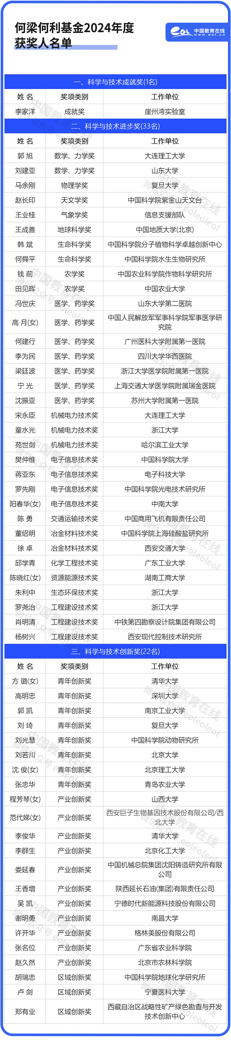 據(jù)介紹,何梁何利基金是香港愛(ài)國(guó)金融實(shí)業(yè)家何善衡、梁銶琚、何添、利國(guó)偉先生于1994年3月30日捐資創(chuàng)立的、以獎(jiǎng)勵(lì)中華人民共和國(guó)杰出科技工作者為宗旨的科技獎(jiǎng)勵(lì)基金。2024年度有1名為我國(guó)科技進(jìn)步與創(chuàng)新作出卓越貢獻(xiàn)的杰出科技工作者,榮獲“何梁何利基金科學(xué)與技術(shù)成就獎(jiǎng)”,授予證書(shū)、獎(jiǎng)金100萬(wàn)港元;33名在科學(xué)技術(shù)領(lǐng)域取得重大發(fā)明、發(fā)現(xiàn)和科技成果的優(yōu)秀科技工作者,榮獲“何梁何利基金科學(xué)與技術(shù)進(jìn)步獎(jiǎng)”,各授予證書(shū)、獎(jiǎng)金20萬(wàn)港元;22名具有高水平科技成就,通過(guò)技術(shù)創(chuàng)新和管理創(chuàng)新,創(chuàng)造重大經(jīng)濟(jì)效益和社會(huì)效益的優(yōu)秀科技工作者,榮獲“何梁何利基金科學(xué)與技術(shù)創(chuàng)新獎(jiǎng)”,各授予證書(shū)、獎(jiǎng)金20萬(wàn)港元。