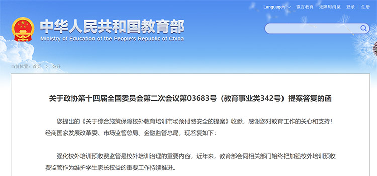 近日,教育部網站發(fā)布“對第十四屆全國委員會第二次會議第03683號提案的答復”,在答復“關于綜合施策保障校外教育培訓市場預付費安全的提案”時,教育部表示,用好“黑白名單”制度,將培訓預收費情況作為校外培訓機構誠信建設的重要內容,依法依規(guī)嚴厲懲治違法失信行為,著力防范化解風險,切實維護人民群眾的合法權益。