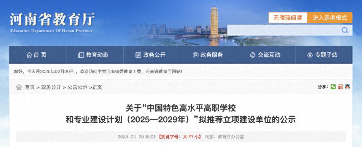 2月20日,河南省教育廳發(fā)布《關(guān)于“中國(guó)特色高水平高職學(xué)校和專(zhuān)業(yè)建設(shè)計(jì)劃(2025—2029年)”擬推薦立項(xiàng)建設(shè)單位的公示》。