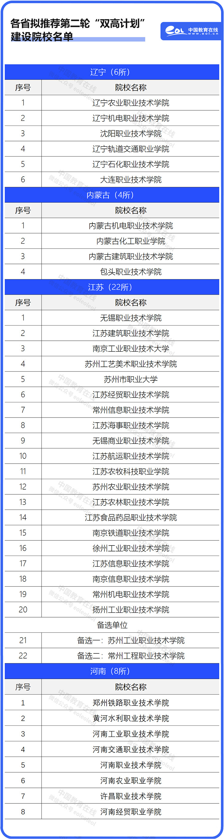 除河南外,近期,江蘇、遼寧、內(nèi)蒙古等地也公示了第二輪國(guó)家“雙高計(jì)劃”推薦名單。截至目前,已有40所院校(含備選)擬獲推薦進(jìn)入新一輪“雙高計(jì)劃”建設(shè)名單。