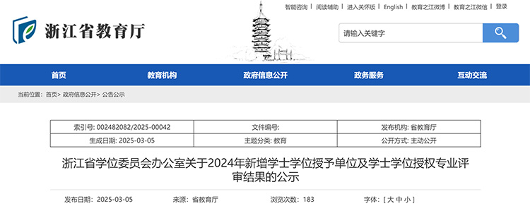 3月5日,浙江省學(xué)位委員會辦公室公示了2024年新增學(xué)士學(xué)位授予單位及學(xué)士學(xué)位授權(quán)專業(yè)評審結(jié)果。