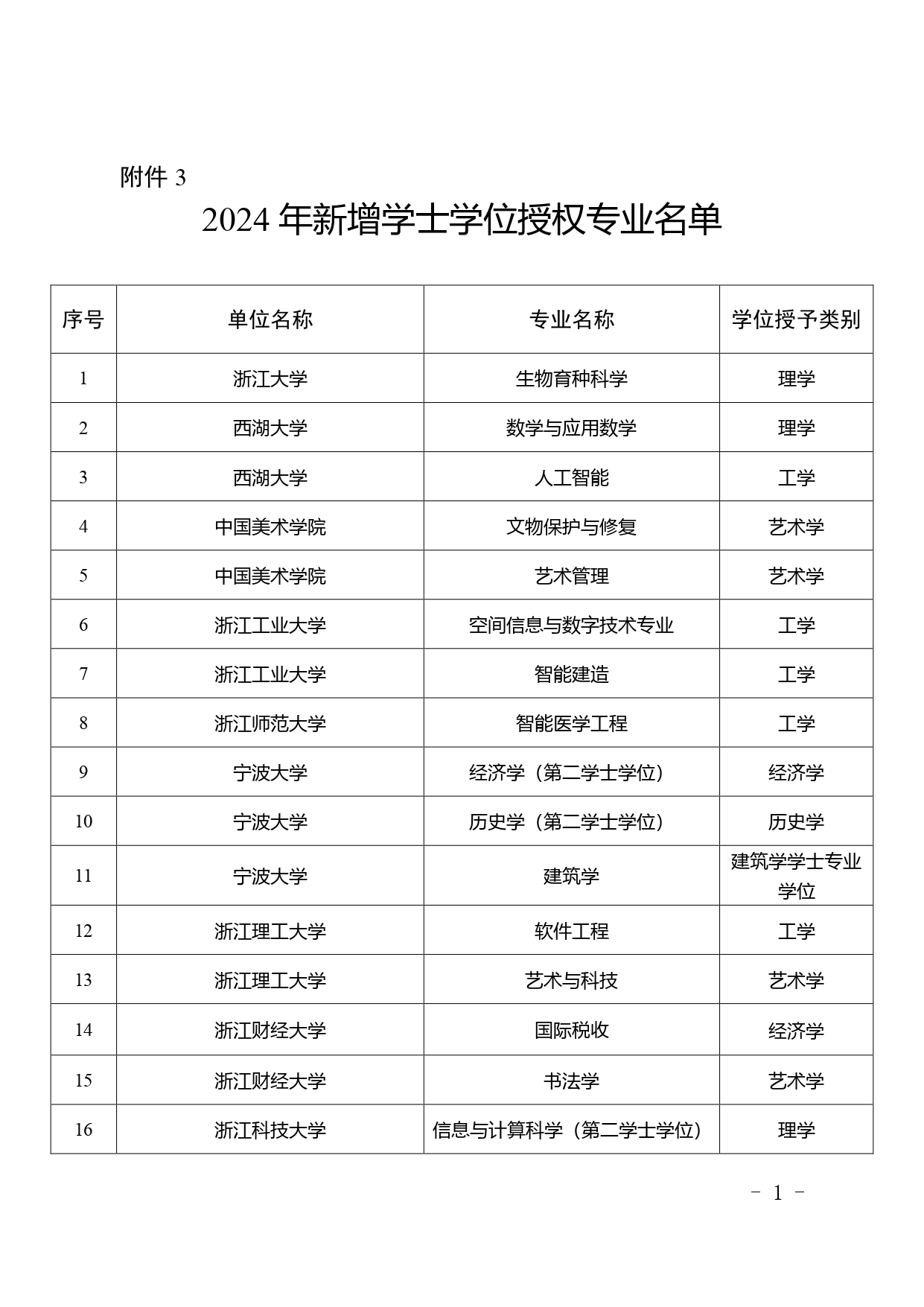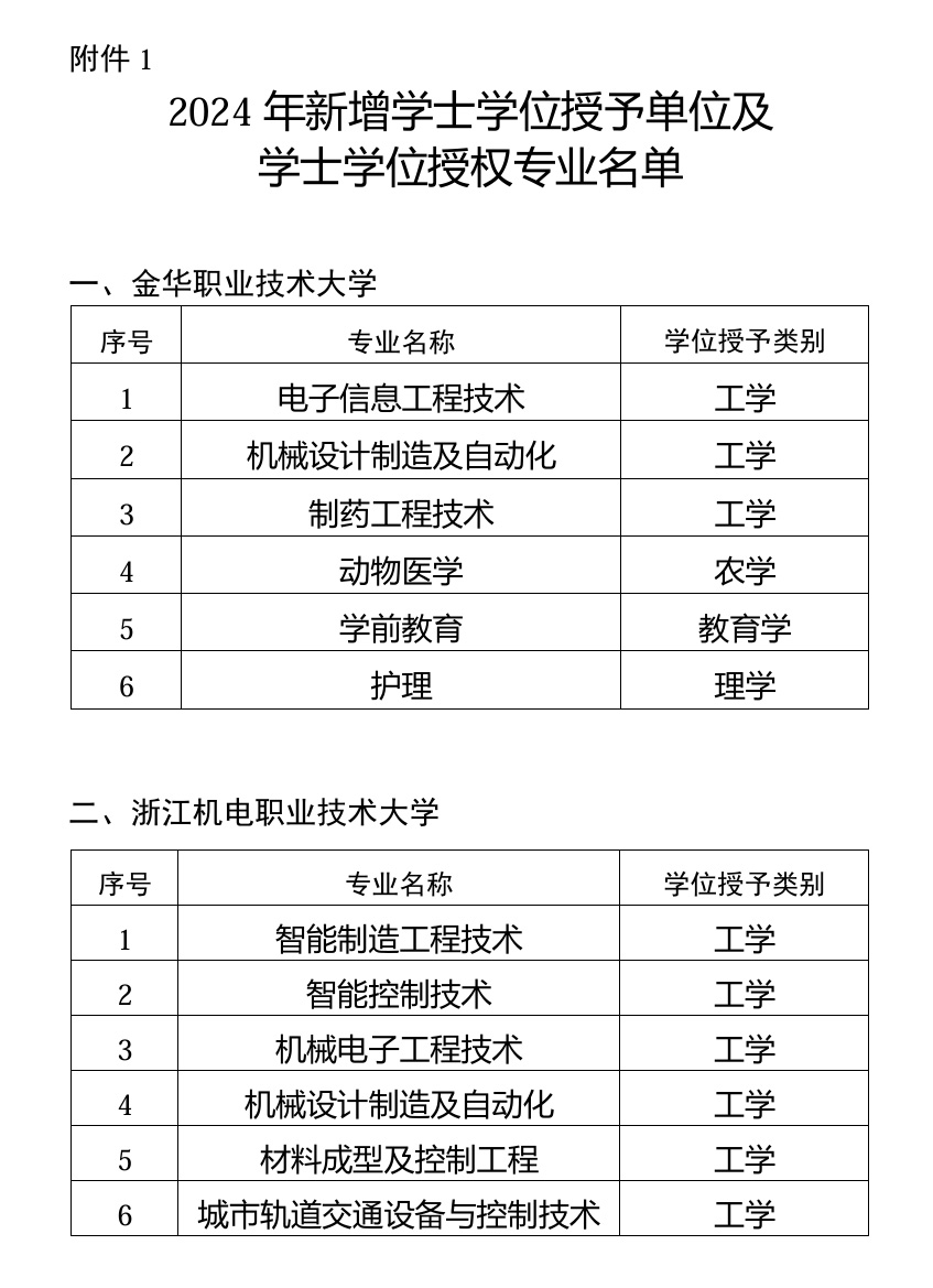 經(jīng)學(xué)校申報、專家評審、省學(xué)位委員會審議,擬新增金華職業(yè)技術(shù)大學(xué)為學(xué)士學(xué)位授予單位,其電子信息工程技術(shù)等6個專業(yè)為學(xué)士學(xué)位授權(quán)專業(yè);新增浙江機電職業(yè)技術(shù)大學(xué)為學(xué)士學(xué)位授予單位,其智能制造工程技術(shù)等6個專業(yè)為學(xué)士學(xué)位授權(quán)專業(yè);新增浙江工商大學(xué)“日語-國際商務(wù)”雙學(xué)士學(xué)位專業(yè)1個;新增浙江大學(xué)生物育種科學(xué)等68個專業(yè)(含第二學(xué)士學(xué)位專業(yè)3個、建筑學(xué)專業(yè)學(xué)位專業(yè)1個)為學(xué)士學(xué)位授權(quán)專業(yè)。