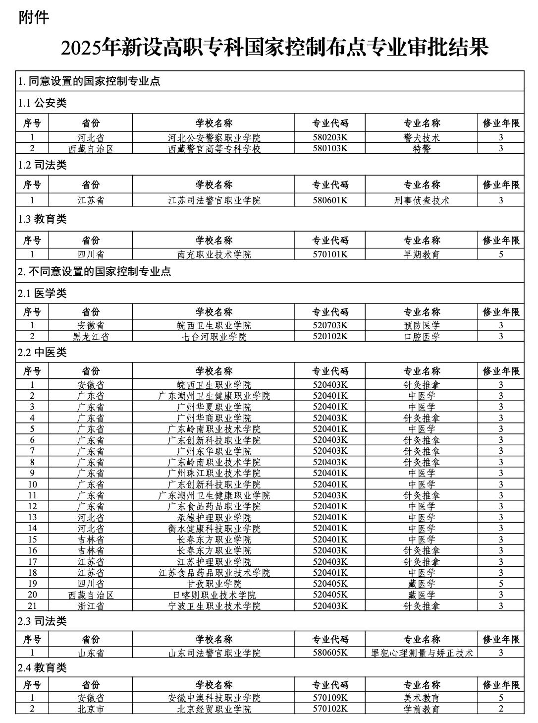 此外,教育部共受理2025年擬新設(shè)國家控制布點(diǎn)專業(yè)申請72個(gè),經(jīng)會同公安部、司法部、國家衛(wèi)生健康委、國家中醫(yī)藥管理局等行業(yè)主管部門審核,同意設(shè)置專業(yè)點(diǎn)4個(gè),不同意設(shè)置專業(yè)點(diǎn)68個(gè)。