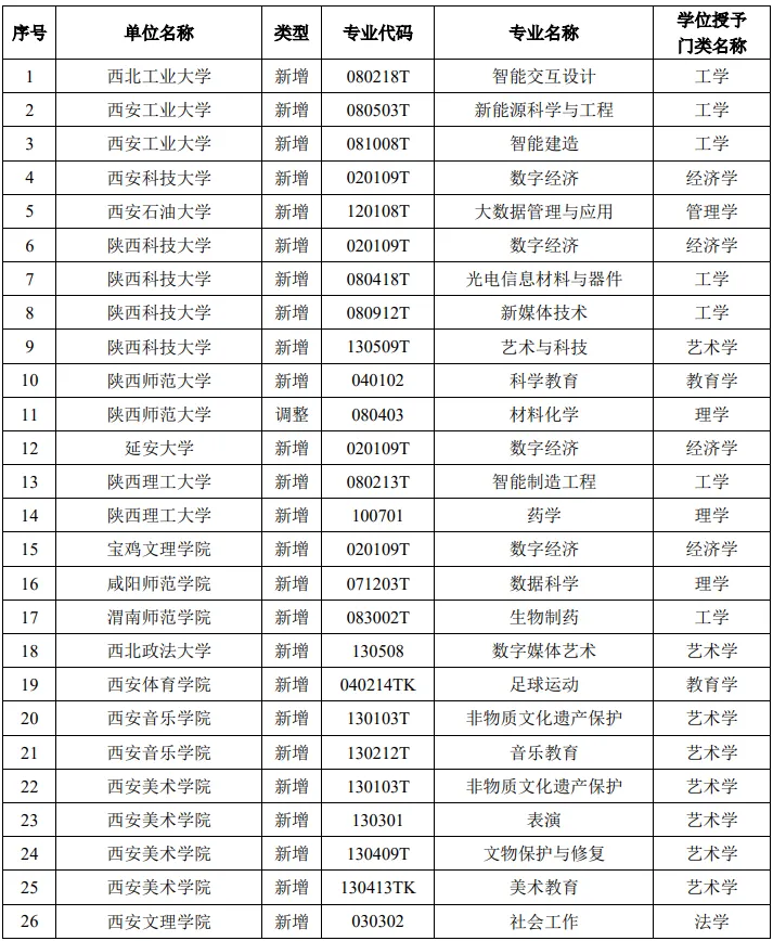 陜西省 2025 年普通高校擬新增學(xué)士學(xué)位授權(quán)專業(yè)名單