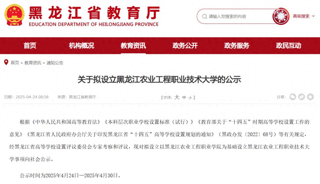 4月24日,黑龍江省教育廳發(fā)布公示,根據(jù)《中華人民共和國高等教育法》《本科層次職業(yè)學(xué)校設(shè)置標(biāo)準(zhǔn)(試行)》《教育部關(guān)于“十四五”時期高等學(xué)校設(shè)置工作的意見》《黑龍江省人民政府辦公廳關(guān)于印發(fā)黑龍江省“十四五”高等學(xué)校設(shè)置規(guī)劃的通知》(黑政辦發(fā)〔2022〕68號)等有關(guān)規(guī)定,經(jīng)黑龍江省高等學(xué)校設(shè)置評議委員會專家考察和評議,現(xiàn)對擬設(shè)立以黑龍江農(nóng)業(yè)工程職業(yè)學(xué)院為基礎(chǔ)設(shè)立黑龍江農(nóng)業(yè)工程職業(yè)技術(shù)大學(xué)事項(xiàng)向社會公示。