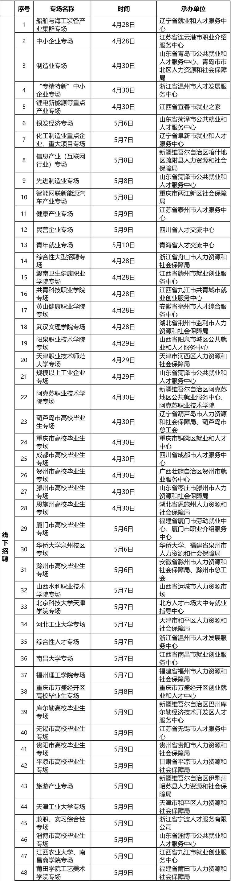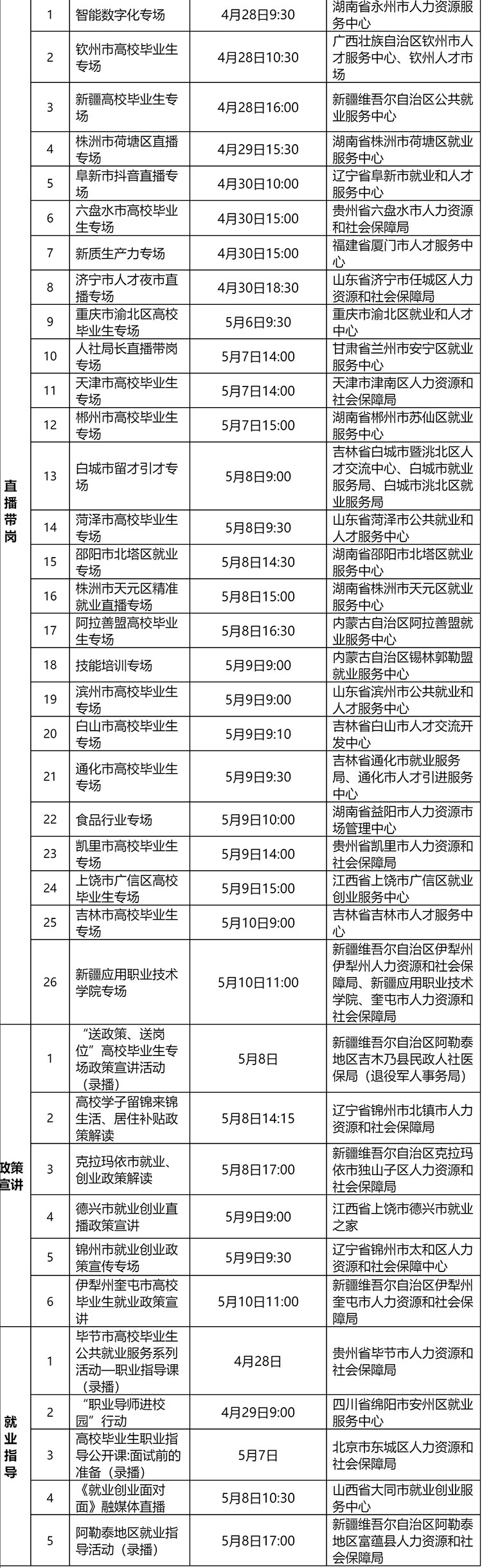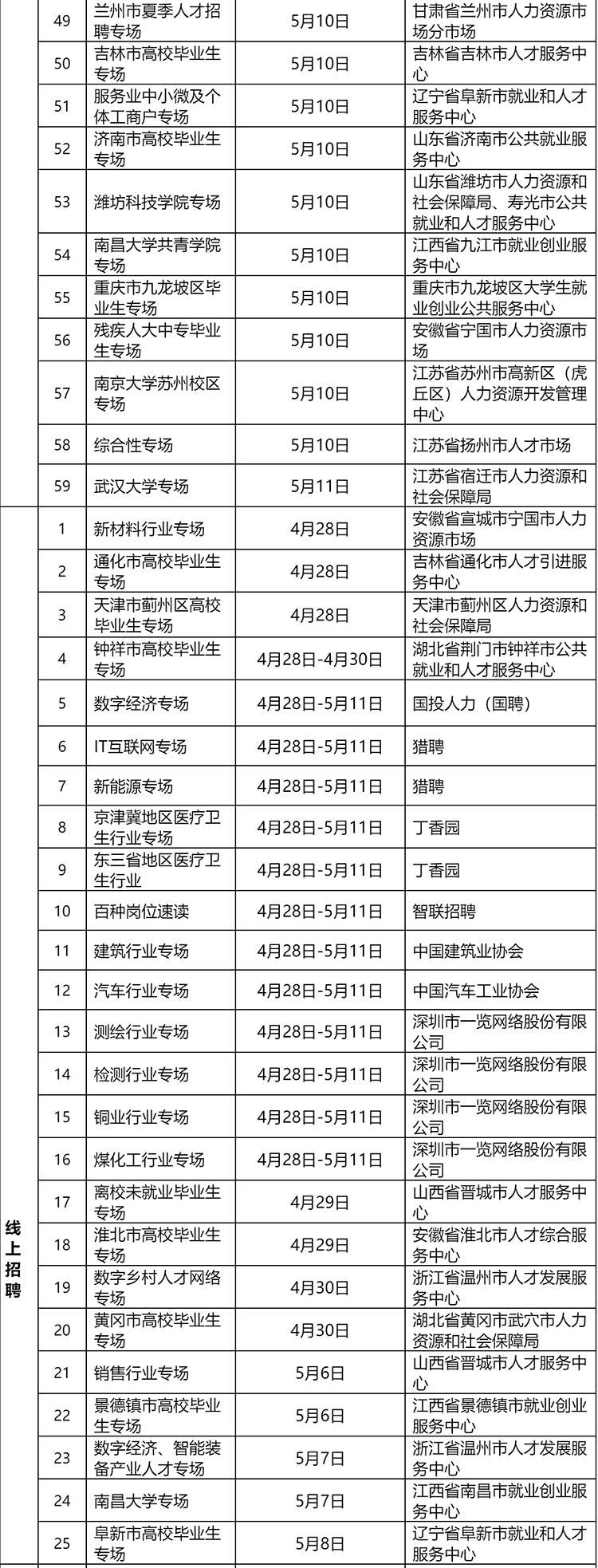 人力資源社會(huì)保障部“職引未來——2025年全國城市聯(lián)合招聘高校畢業(yè)生春季專場”推出第五批特色服務(wù)活動(dòng),其中包括84場面向先進(jìn)制造、新能源、銀發(fā)經(jīng)濟(jì)、數(shù)字經(jīng)濟(jì)等行業(yè)、領(lǐng)域,以及京津冀、東北三省等區(qū)域的線上線下專場招聘會(huì);26場直播帶崗活動(dòng);11場政策宣講和就業(yè)指導(dǎo)直播(錄播)課等,為高校畢業(yè)生提供精準(zhǔn)化、多元化就業(yè)服務(wù)。