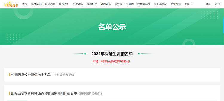 近日,教育部陽光高考平臺(tái)公布了2025年保送生資格名單。該名單主要涵蓋國際五項(xiàng)學(xué)科奧林匹克競賽國家集訓(xùn)隊(duì)員和外國語學(xué)校推薦保送生兩類學(xué)生。