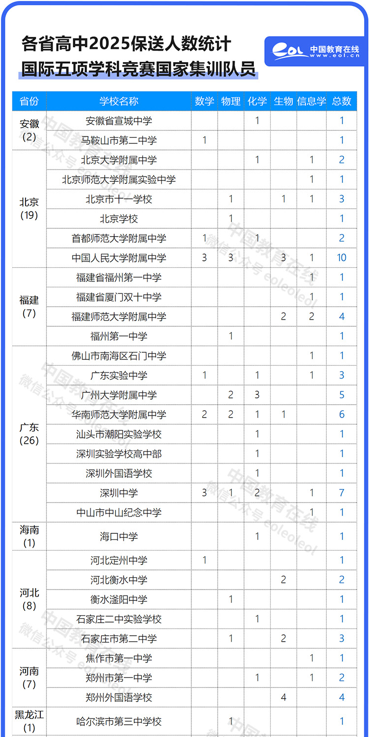 公示的名單中,今年共有260名高中生入選了2025年國際五項(xiàng)學(xué)科奧林匹克競賽國家集訓(xùn)隊(duì),提前獲得了清北保送資格。其中,入選人數(shù)最多的是浙江省,一共有33人;湖南和重慶均入選27人,位居第2;廣東以26人位居第3;上海25人位居第4;入選超過10人的省份還有:四川22人、北京19人,湖北18人,江蘇15人。