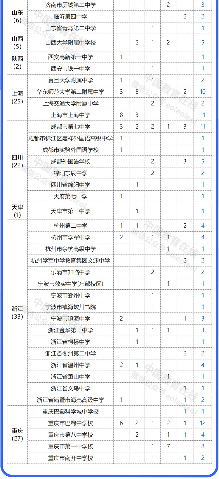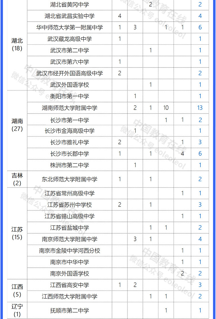據(jù)統(tǒng)計(jì),這260名同學(xué)來自98所高中。其中,湖南師范大學(xué)附屬中學(xué)以13人入選位列第1;入選超出10人的還有:重慶市巴蜀中學(xué)校12人,上海市上海中學(xué)11人,成都市第七中學(xué)11人,中國人民大學(xué)附屬中學(xué)10人,華東師范大學(xué)第二附屬中學(xué)10人。