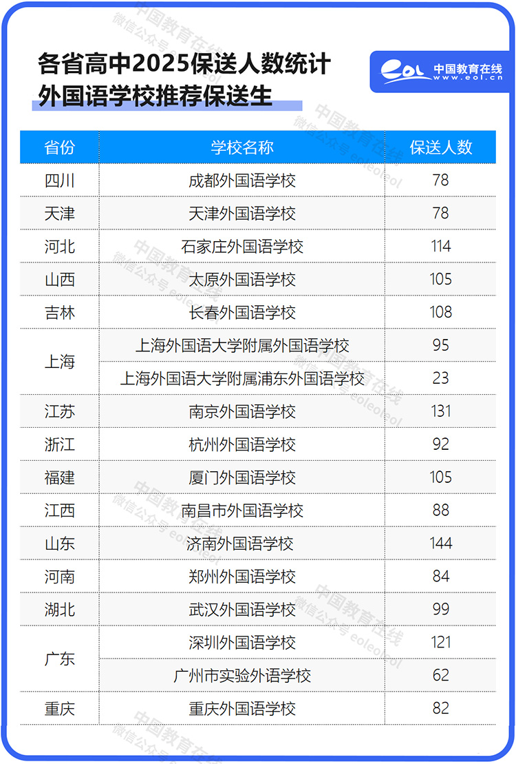 此外,全國還有1609位高三學(xué)生以外語類保送生推薦獲得了保送至北京外國語大學(xué)、上海外國語大學(xué)等高校的資格。其中,濟(jì)南外國語學(xué)校具有外語類保送生資格人數(shù)最多,達(dá)到144人,其次是南京外國語學(xué)校,131人。