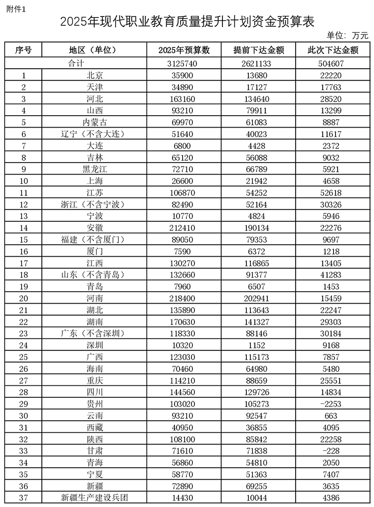 5月19日,財(cái)政部、教育部發(fā)布《關(guān)于下達(dá)2025年現(xiàn)代職業(yè)教育質(zhì)量提升計(jì)劃資金預(yù)算的通知》(下簡(jiǎn)稱《通知》)。據(jù)《2025年現(xiàn)代職業(yè)教育質(zhì)量提升計(jì)劃資金預(yù)算表》顯示,2025年預(yù)算數(shù)合計(jì)312.57億元,提前下達(dá)金額262.11億元,此次下達(dá)金額50.46億元。