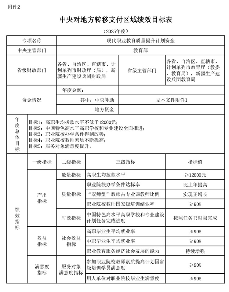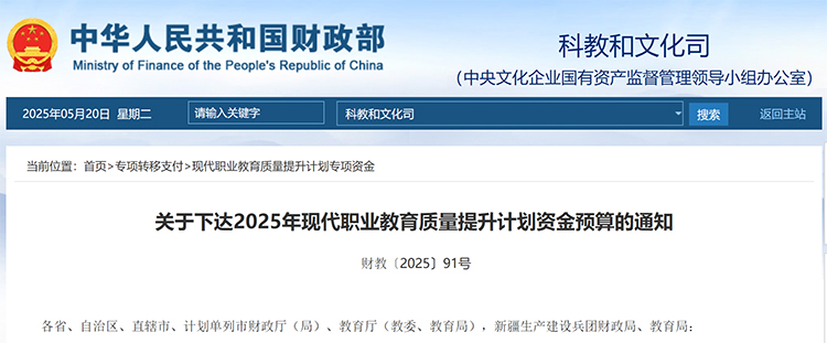 關(guān)于下達(dá)2025年現(xiàn)代職業(yè)教育質(zhì)量提升計(jì)劃資金預(yù)算的通知 財(cái)教〔2025〕91號(hào)