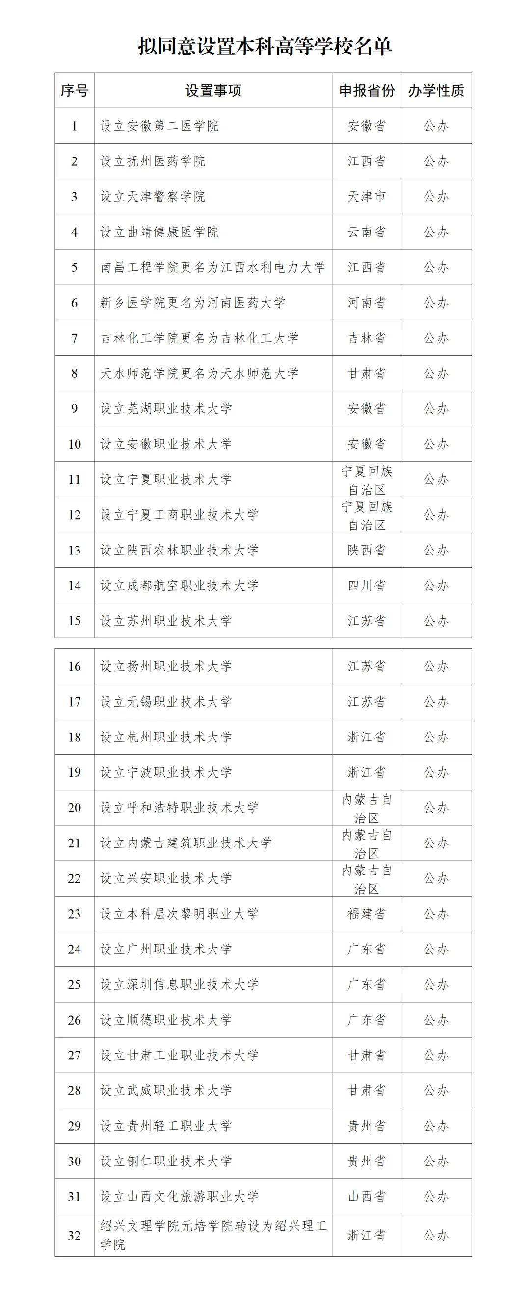 根據(jù)《中華人民共和國高等教育法》《普通高等學(xué)校設(shè)置暫行條例》《普通本科學(xué)校設(shè)置暫行規(guī)定》《本科層次職業(yè)學(xué)校設(shè)置標(biāo)準(zhǔn)(試行)》等有關(guān)規(guī)定以及第八屆全國高等學(xué)校設(shè)置評議委員會考察評議結(jié)果,經(jīng)教育部黨組會議審議,擬同意設(shè)置安徽第二醫(yī)學(xué)院等32所學(xué)校,現(xiàn)予公示。