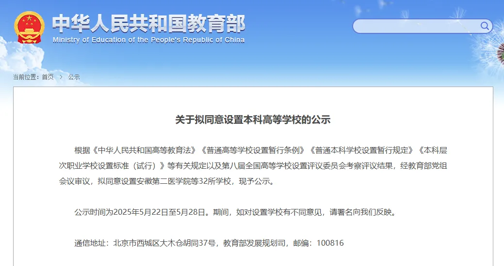 5月22日,教育部發(fā)布“關(guān)于擬同意設(shè)置本科高等學(xué)校的公示”。