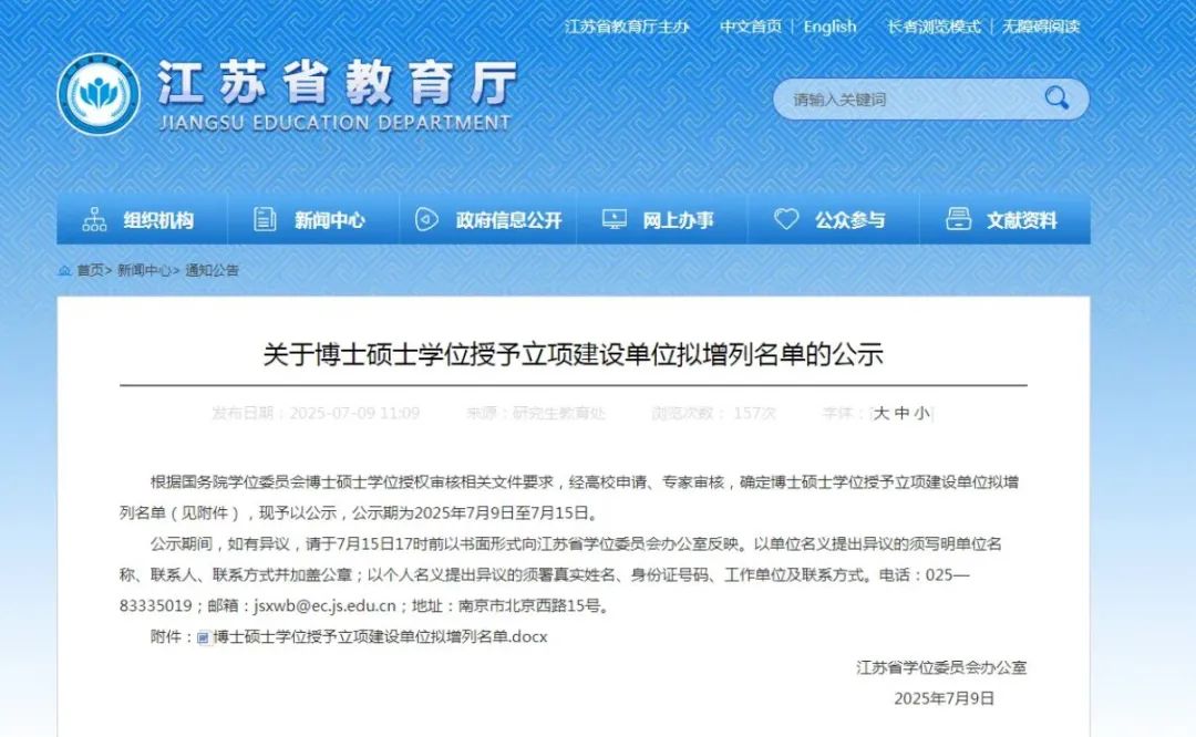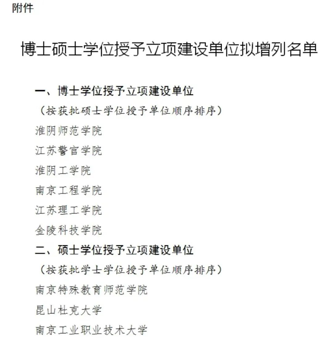 7月9日,江蘇省教育廳發(fā)布《關(guān)于博士碩士學(xué)位授予立項建設(shè)單位擬增列名單的公示》。名單顯示,淮陰師范學(xué)院、江蘇警官學(xué)院、淮陰工學(xué)院、南京工程學(xué)院、江蘇理工學(xué)院、金陵科技學(xué)院等6所高校擬獲批博士學(xué)位授予立項建設(shè)單位;南京特殊教育師范學(xué)院、昆山杜克大學(xué)、南京工業(yè)職業(yè)技術(shù)大學(xué)等3所學(xué)校擬獲批碩士學(xué)位授予立項建設(shè)單位。