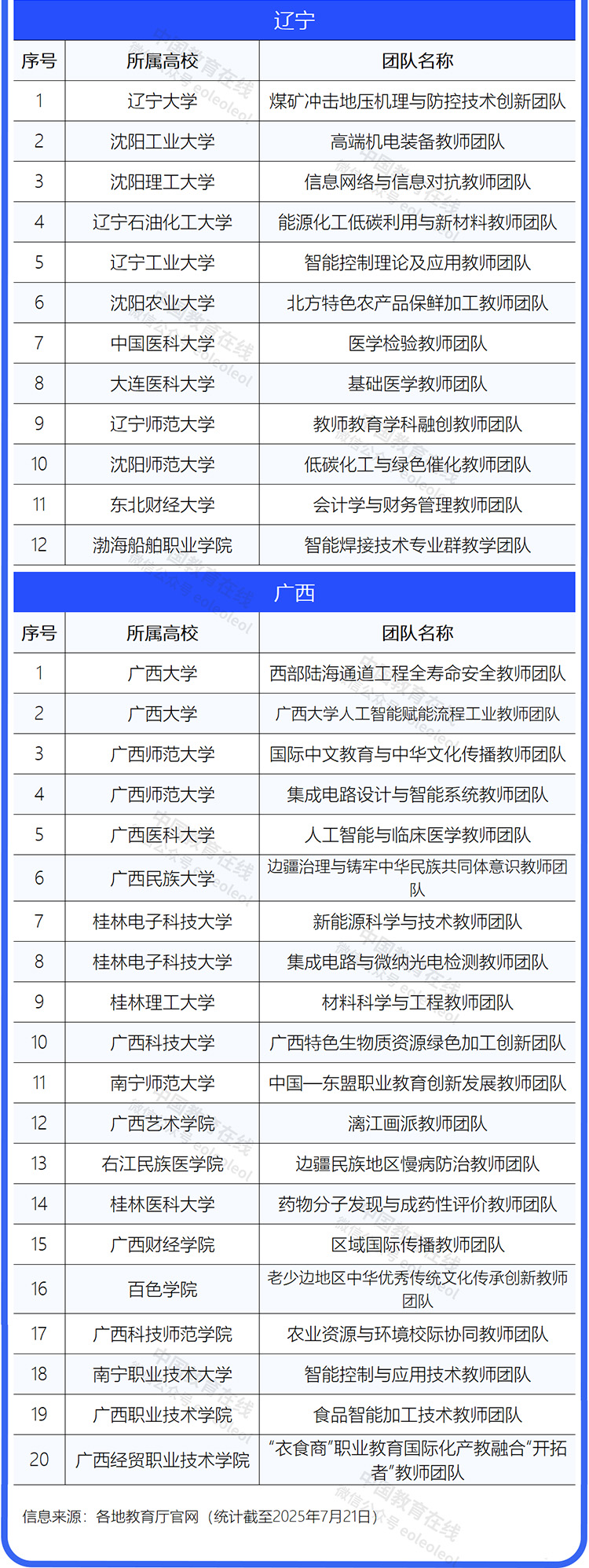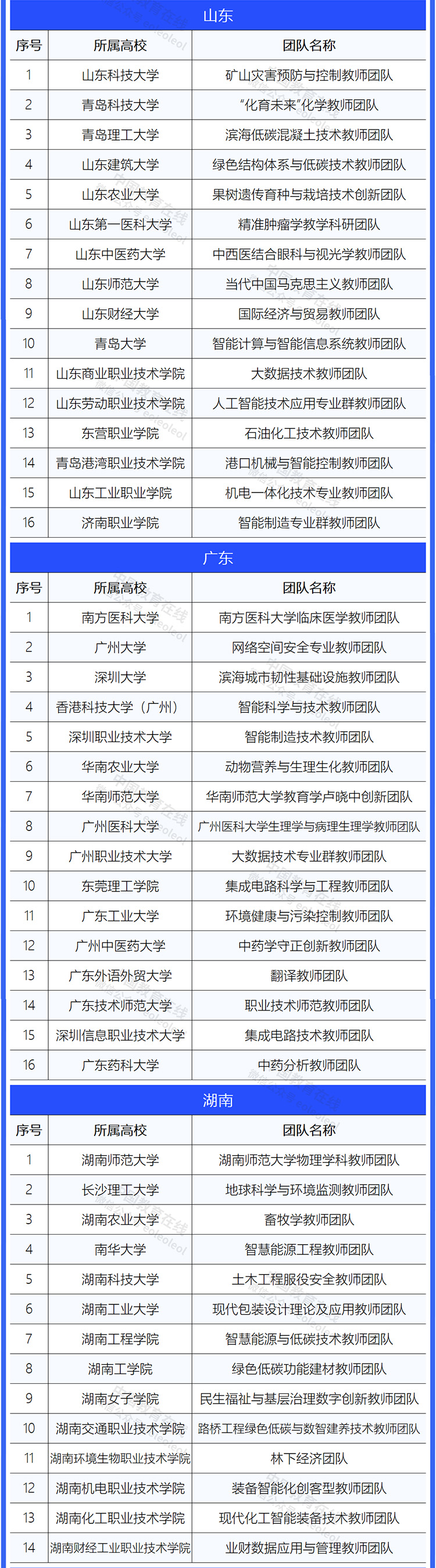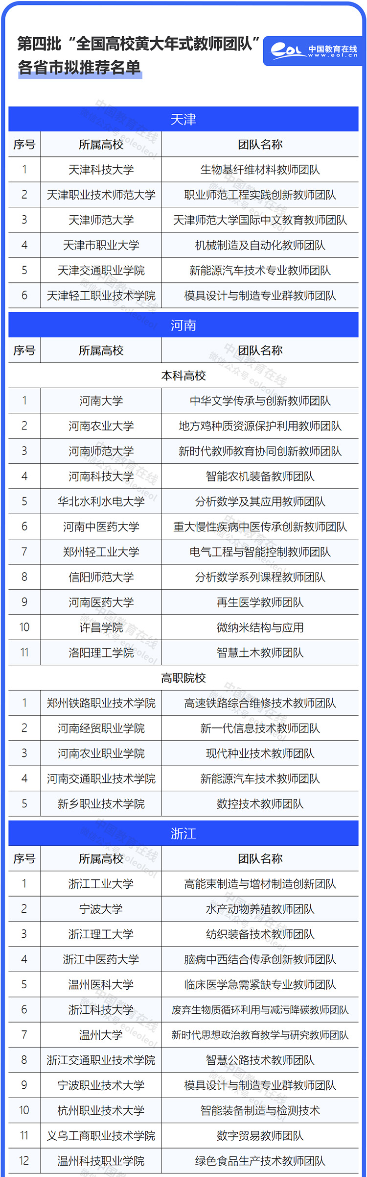 截至目前,遼寧、浙江、山東、天津、河南、湖南、廣西、廣東等地已陸續(xù)發(fā)布第四批“全國高校黃大年式教師團隊”創(chuàng)建活動擬推薦名單的公示。據(jù)統(tǒng)計,共計有109所高校的教師團隊納入擬推薦名單。