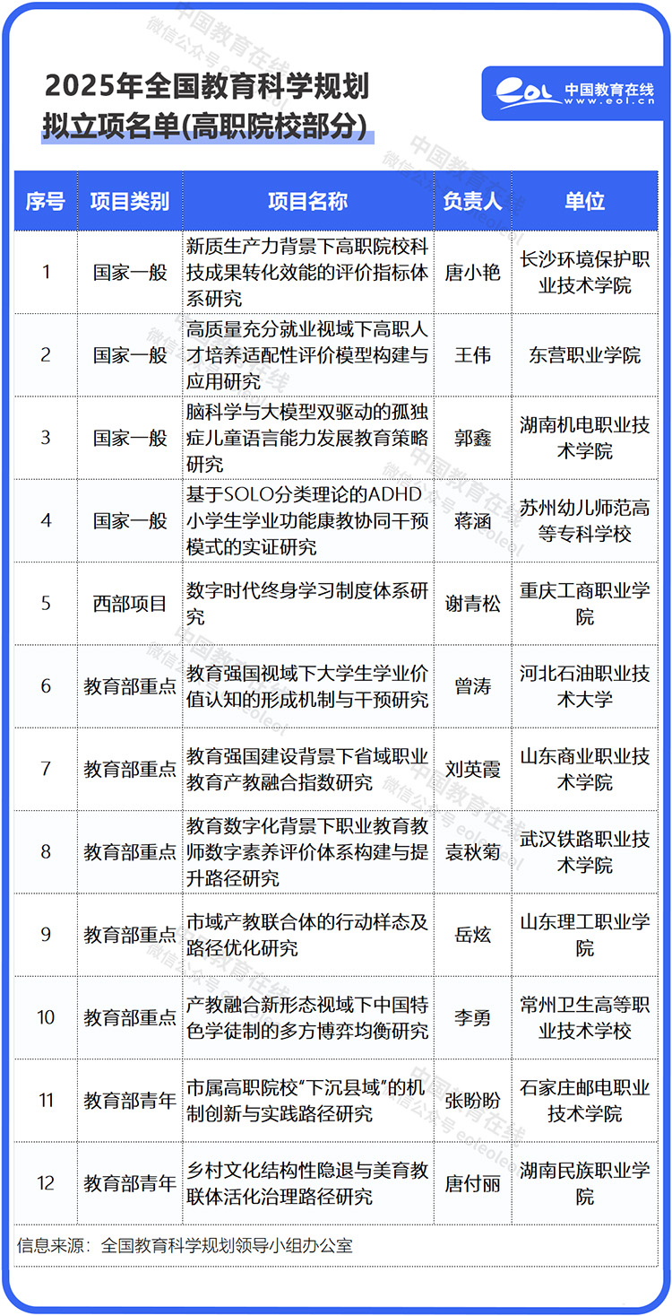 8月5日,全國教育科學(xué)規(guī)劃領(lǐng)導(dǎo)小組辦公室發(fā)布《2025年度全國教育科學(xué)規(guī)劃擬立項名單公示》。共540項個項目擬獲立項資助,其中包括12所高職院校申報的12個項目。