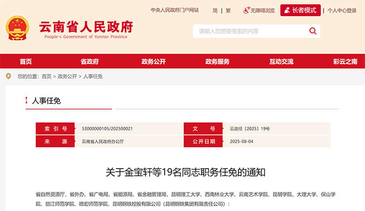 近日,云南省人民政府發(fā)布《關(guān)于金寶軒等19名同志職務(wù)任免的通知》,其中涉及昆明理工大學(xué)、西南林業(yè)大學(xué)、云南藝術(shù)學(xué)院、昆明學(xué)院、大理大學(xué)、保山學(xué)院、麗江師范學(xué)院、德宏師范學(xué)院等多所高校。