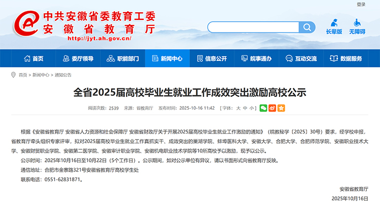 近日,安徽省教育廳發(fā)布《全省2025屆高校畢業(yè)生就業(yè)工作成效突出激勵高校公示》。經學校申報,省教育廳牽頭組織專家評審,擬對2025屆高校畢業(yè)生就業(yè)工作真抓實干、成效突出的巢湖學院、蚌埠醫(yī)科大學、安徽大學、合肥大學、合肥師范學院、安徽職業(yè)技術大學、安徽財貿職業(yè)學院、安徽第二醫(yī)學院、安徽審計職業(yè)學院、安徽機電職業(yè)技術學院等10所高校予以激勵,現(xiàn)予以公示。